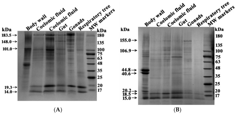Figure 6. SDS-PAGE analysis of multiprotein complexes (4–16 µg) from different organs of sea cucumbers. Separation was performed on a 4–18% gradient gel before (A) and after (B) treatment with DTT. Molecular mass markers are indicated. The gels were stained using Coomassie R-250. For other details, see Section 4.