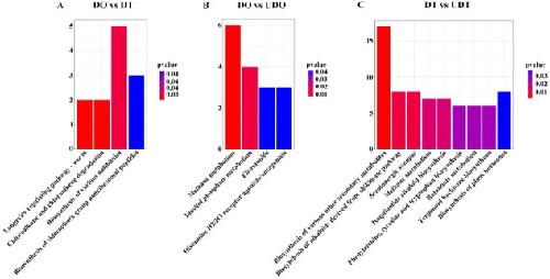 Fig. 6. KEGG pathway analysis of DEMs between the compared gonadal groups. The vertical axis represents the number of DEMs associated with each pathway, while the horizontal axis indicates the KEGG significantly pathways enriched by DEMs. Pathway maps are based on the KEGG database 42–44.