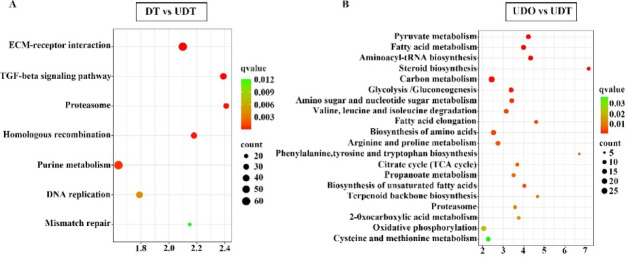 Fig. 4. KEGG pathway analysis of DEGs between the compared gonadal groups. (A) KEGG pathway analysis of DEGs between differentiated testes and undifferentiated testes. (B) KEGG pathway analysis of DEGs between undifferentiated ovaries and undifferentiated testes. The vertical axis shows KEGG pathways that are significantly enriched by DEGs, and the horizontal axis indicates the corresponding enrichment factors. Pathway maps are based on the KEGG database 42–44.