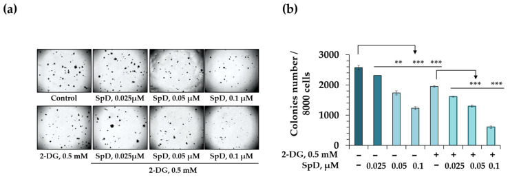 Figure 4. The effect of SpD from the starfish S. pacificus in combination with 2-DG on the colony formation in TNBC cells MDA-MB-231. (a,b) MDA-MB-231 cells were pre-treated with 2-DG at concentrations of 0.5 mM and then treated with SpD at concentrations of 0.025, 0.05, and 0.1 µM in soft agar. The number of colonies was counted under a Motic AE 20 microscope (total magnification of 10×) using ImageJ version 1.50i software bundled with 64-bit Java 1.6.0_24. Results are presented as mean ± standard deviation (SD). The one-way ANOVA and the Tukey’s HSD test for multiple comparisons show statistical significance as compared to DMSO-treated cells (control) or 2-DG-treated cells (** p < 0.01; *** p < 0.001). |