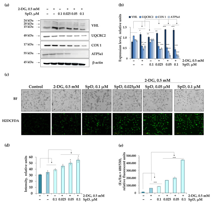 Figure 5. The effect of SpD from the starfish S. pacificus in combination with 2-DG on the expression level of enzymes of mitochondrial complexes and ROS generation in TNBC cells MDA-MB-231. MDA-MB-231 cells were treated by either 2-DG (0.5 mM) or SpD (0.1 µM) alone or by 2-DG (0.5 mM) in combination with SpD (0.025, 0.05, and 0.1 µM) and subjected to Western Blot or fluorescence microscopy and spectrometry assays. (a) The regulation of the expression level of VHL tumor suppressor, UQCRC2 (complex III), COX1 (complex IV), ATP5a1 (complex V), and β-actin was quantified by Western Blot assay. (b) Relative expression level was measured using the Quantity One 1D analysis version 4.6.7 software. Expression level was normalized to the total level of β-actin. (c) Fluorescence microscopic images were taken under CELENA® X High Content Imaging System at a total magnification of 10×, aided with cell-integrated CELENA® X Cell Analyzer software version 1.6.0. (d) Fluorescence intensity of H2DCFDA in MDA-MB-231 cells was determined by ImageJ version 1.50i software bundled with 64-bit Java 1.6.0_24. (e) Fluorometric quantification of ROS level by Synergy H1 multimode microplate reader. Results are expressed as mean ± SD. The one-way ANOVA and the Tukey’s HSD test for multiple comparisons show statistical significance as compared to DMSO-treated cells (control) or 2-DG-treated cells (* p < 0.05; ** p < 0.01; *** p < 0.001). |