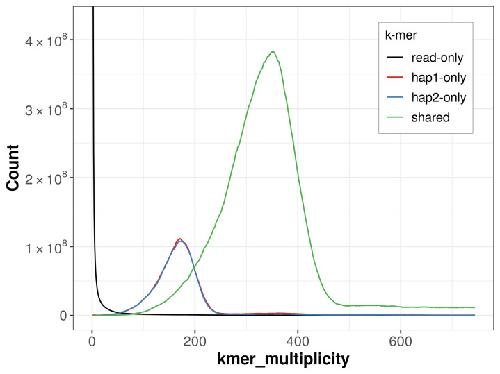 k-mers from the original read data in the final assemblies. The horizontal axis represents