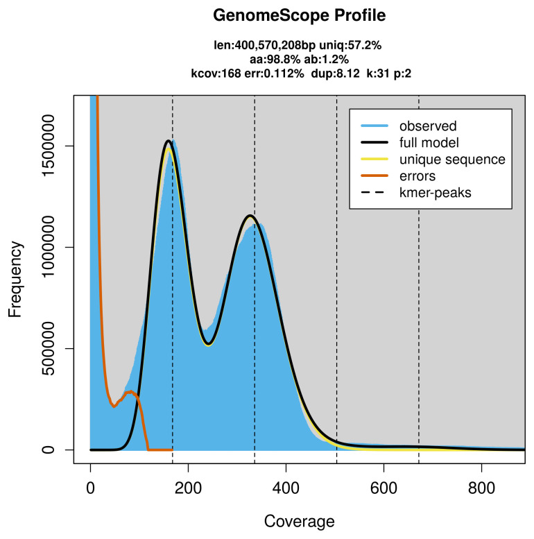 k-mers generated using GenomeScope2. The plot shows observed and modelled