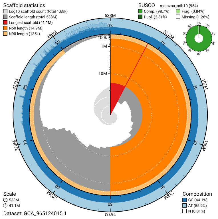 Figure 5. . Assembly metrics for eaAnsPlac2.hap1.1.The BlobToolKit snail plot provides an overview of assembly metrics and BUSCO gene completeness. The circumference represents the length of the whole genome sequence, and the main plot is divided into 1 000 bins around the circumference. The outermost blue tracks display the distribution of GC, AT, and N percentages across the bins. Scaffolds are arranged clockwise from longest to shortest and are depicted in dark grey. The longest scaffold is indicated by the red arc, and the deeper orange and pale orange arcs represent the N50 and N90 lengths. A light grey spiral at the centre shows the cumulative scaffold count on a logarithmic scale. A summary of complete, fragmented, duplicated, and missing BUSCO genes in the set is presented at the top right. An interactive version of this figure can be accessed on the