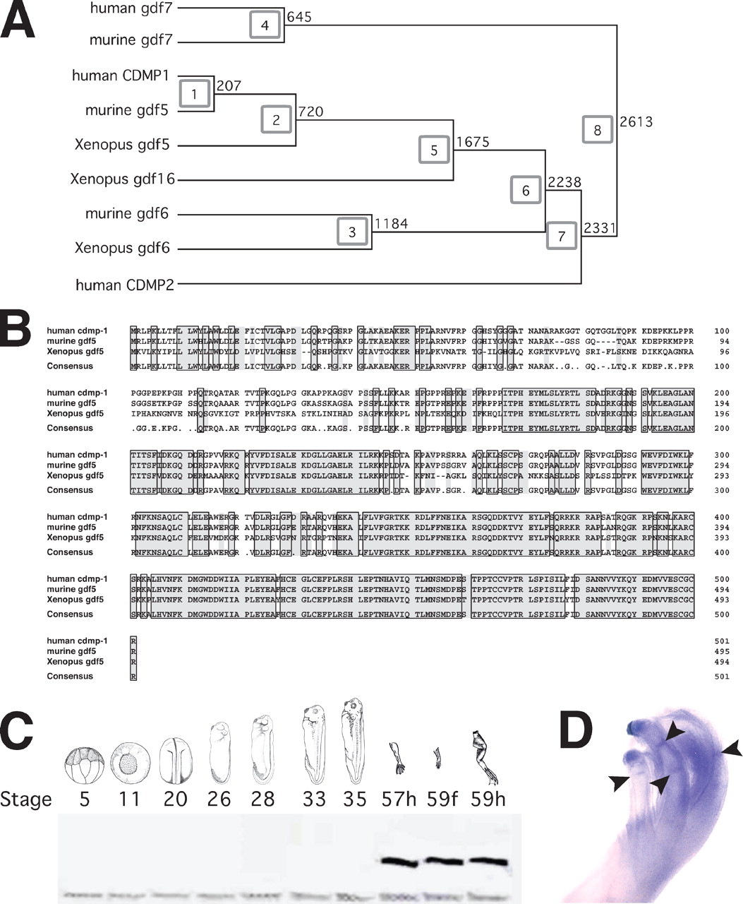 Characterization and expression analysis of Xenopus GDF5. A, dendrogram showing the phylogenetic relationship between members of the GDF5, -6, -7, and -16 subfamily. Full-length amino acid sequences were analyzed using GeneWorks® Version 2.2 (IntelliGenetics, Inc.) software. B, amino acid sequence comparison of full-length human, mouse, and Xenopus GDF5. Sequence identities are boxed; sequence similarities are highlighted in gray. C, RT-PCR analysis for Xenopus GDF5 using RNA obtained from indicated stages of Xenopus development (h = hindlimb; f = forelimb). D, whole mount hybridization in situ of Xenopus GDF5 of a stage 59 Xenopus forelimb. Arrows indicate the location of positive signal at presumptive joint interzones. Image published in: Thomas JT et al. (2006) Copyright © 2006. Image reproduced with permission of the Publisher.