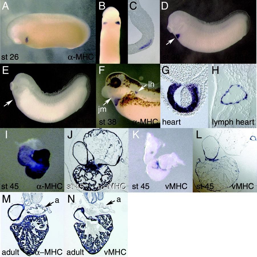 Figure 2. In situ hybridization analysis of developmental expression of the Xenopus alpha -MHC and vMHC genes. A: Lateral view of stage 26 embryos showing alpha -MHC transcripts in the bisymmetric heart patches. B: Ventral view of embryo in A. C: Transverse section through the heart patch of stage 26 embryo. D: Lateral view of stage 30 embryo showing increased alpha -MHC expression in precardiac tissues (arrow). E: Lateral view of stage 30 embryo showing an absence of vMHC expression at this stage of development. F: Lateral view of stage 38 embryo showing alpha -MHC expression in the heart, muscles of the jaw (jm), and the lymph heart (lh). G: Transverse section through stage 36 heart shows that alpha -MHC expression is confined to the myocardium. H: Transverse section through the lymph heart (stage 38) stained for alpha -MHC. I,J: Whole-mount and section in situ hybridizations, respectively, of stage 45 heart showing that alpha -MHC is expressed in all chambers and outflow tract. K,L: Whole-mount and section in situ hybridizations, respectively, of stage 45 heart, showing restricted expression of vMHC in a ring around the outflow tract and the atria at the junction with the ventricle. M: Section in situ of adult Xenopus heart shows that alpha -MHC is expressed throughout the myocardium, including the atria (a) and outflow tract. N: Section in situ hybridization of adult Xenopus heart shows that vMHC is expressed in the myocardium of the outflow tract and ventricle but not the atria. Image published in: Garriock RJ et al. (2005) Copyright © 2005. Image reproduced with permission of the Publisher, John Wiley & Sons.
