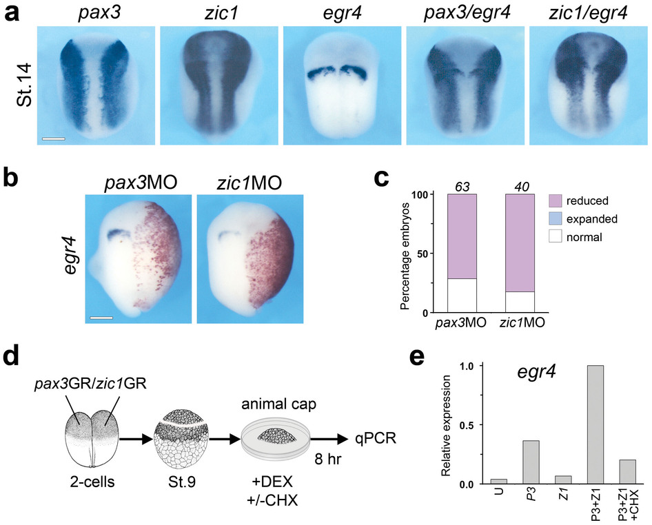 Figure 1: egr4 is a downstream target of Pax3 and Zic1. (a) Whole-mount in situ hybridization for egr4, pax3 and zic1. The DIG-labeled probes were used alone or in combination (pax3/egr4 and zic1/egr4). Dorsal views, anterior to top. Scale bar, 300 μm. (b) Injection in one blastomere at the 2-cell stage of MOs to block Pax3 (pax3MO; 40 ng) or Zic1 (zic1MO; 40 ng) function resulted in a reduction of egr4 expression. The injected side is to the right as indicated by the presence of the lineage tracer (Red-Gal). Dorsal views, anterior to top. Scale bar, 300 μm. (c) The graph indicates the percentage of embryos with normal (white) or reduced/lost (red) egr4 expression. The number of embryos analyzed is indicated on top of each bar. (d) mRNA encoding pax3GR and zic1GR (100 pg each), alone or in combination were injected into both blastomeres in the animal pole at the 2-cell stage. At the blastula stage (stage 9), animal cap explants were dissected and cultured for 8 hours in the presence of dexamethasone (DEX). In some samples, cyclohexamide (CHX) was used to block protein synthesis. (e) egr4 expression in pax3GR and zic1GR injected animal cap explants analyzed by qPCR. Image published in: Bae CJ et al. (2015) Copyright © 2015, Macmillan Publishers Limited. Creative Commons Attribution license