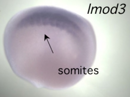 lmod3 (leiomodin 3 (fetal)) gene expression in Xenopus laevis embryo, assayed via in situ hybridization, NF stage 15, lateral view, anterior left, dorsal up. This image is extracted from figure published in: Nworu CU et al. (2015), Image published in: Nworu CU et al. (2015) Copyright © 2015. Image reproduced with permission of the Publisher, The Company of Biologists Ltd.