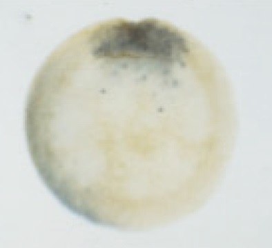 nodal3.2 (nodal homolog 3, gene 2) gene expression in Xenopus laevis embryo, assayed via in situ hybridization, NF stage 10.25, vegetal view, dorsal up. This image is extracted from figure published in: Ecochard V et al. (1995), Image published in: Ecochard V et al. (1995) Copyright © 1995. Image reproduced with permission of the Publisher, Elsevier B. V.