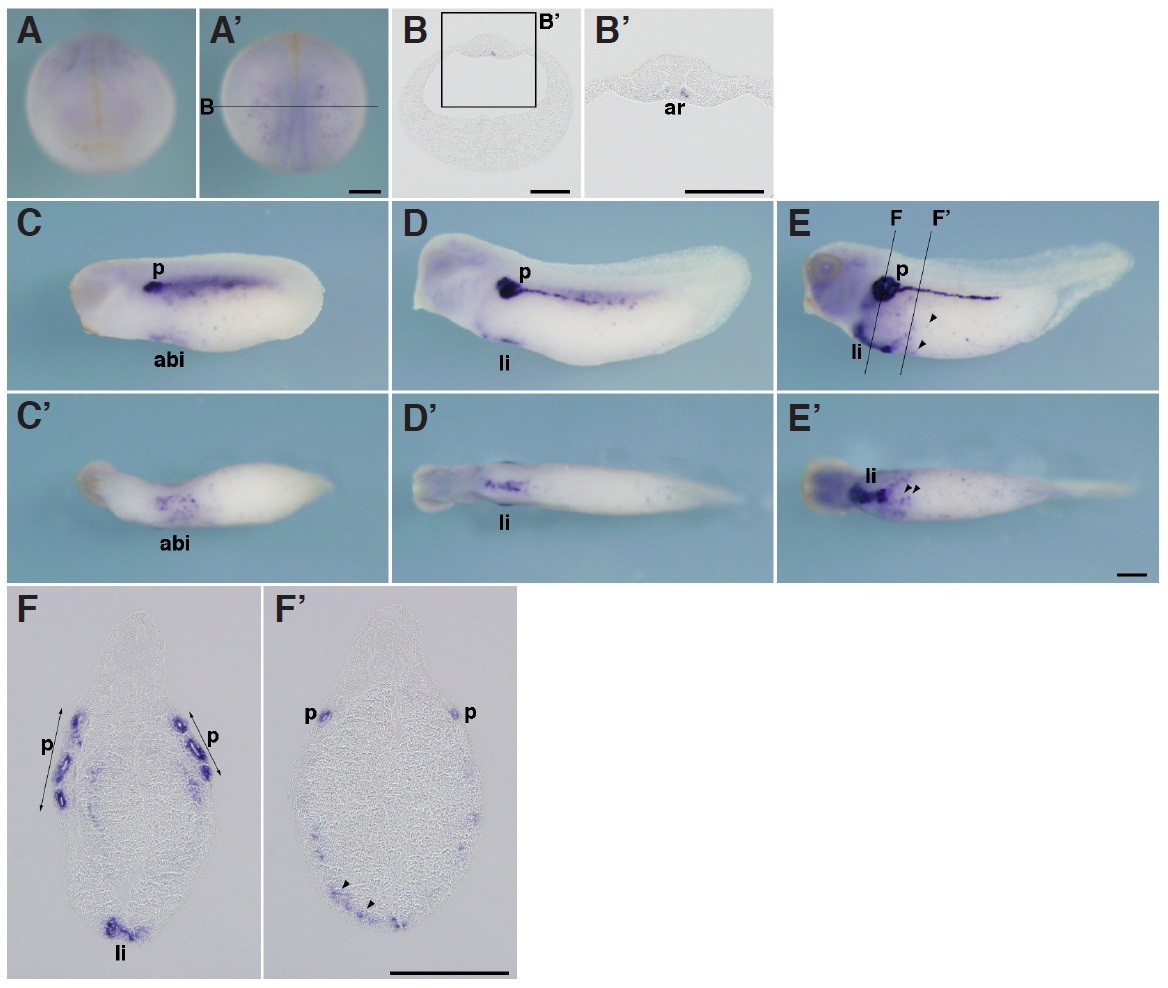 Fig.2. In situ hybridization analysis of igfbp1 during X. tropicalis development. (A,Aâ) Stage 20, (A) Anterior view (Aâ) dorsal view. (B,Bâ) Transversal section of an embryo at stage 20. (Bâ) Magnified view of the boxed area in (B). Dorsal side is displayed towards the top. Igfbp1 is expressed in part of the archenteron roof near the dorsal midline. (C,Câ) Stage 25, (D,Dâ) stage 30, (E,Eâ) stage 35, (C,D,E) lateral view, (Câ,Dâ,Eâ) ventral view. (F,Fâ) Transversal section of an embryo at stage 35. Positions of sections are indicated by black lines, and letters mark corresponding panels. ar, archenteron roof; abi, anterior blood islands; li, liver; p, pronephric tubule. Arrowheads indicate scattered blood-like cells. Scale bars indicate 200 mm. Image published in: Haramoto Y et al. (2014) Copyright © 2014. Image reproduced with permission of the Publisher, University of the Basque Country Press.