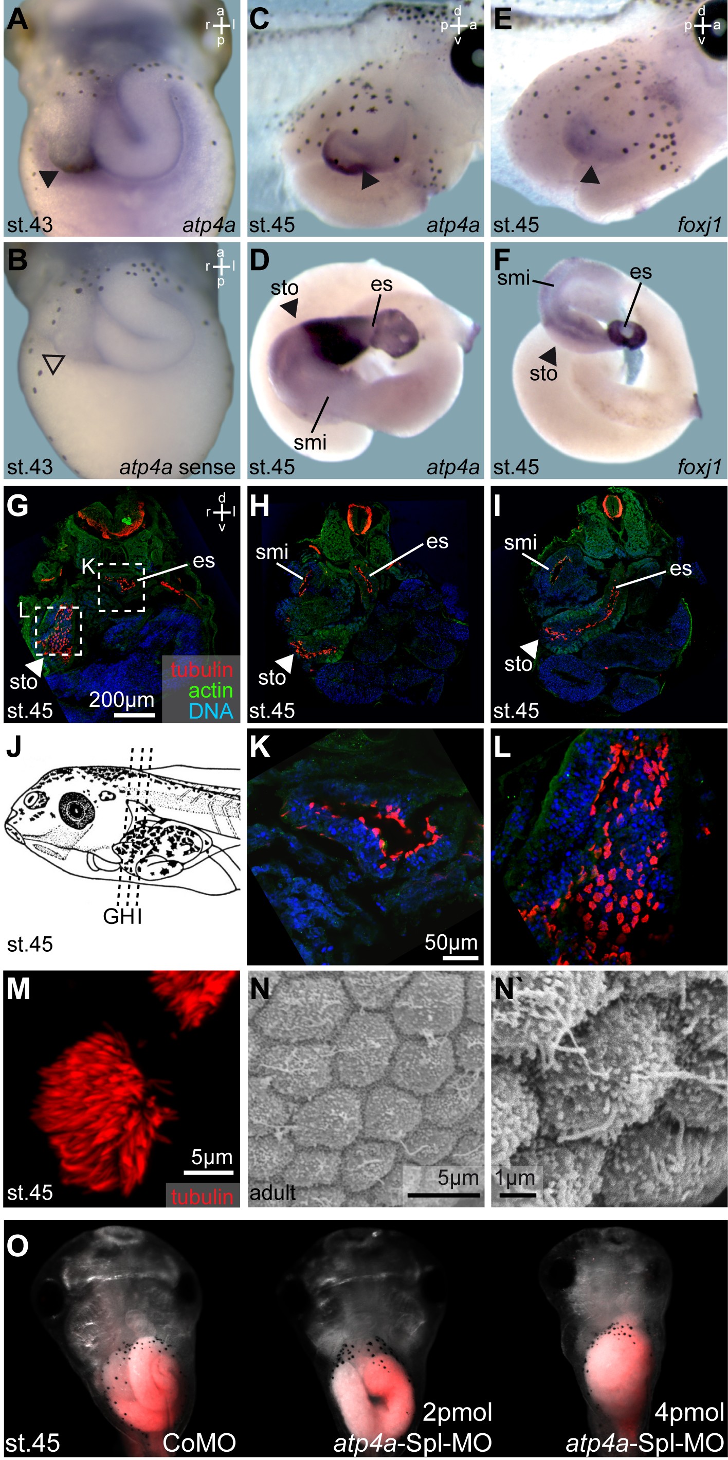 foxj1 and atp4a are co-expressed in the gastrointestinal tract which transiently harbors motile cilia in the stomach. (AâF) WMISH for atp4a (A,C,D) and foxj1 (E,F) in the GI tract of stage 43â45 tadpoles (AâC, E; stomach highlighted by arrowheads; ventral views) and isolated GI tracts (D, F). (B) atp4a sense control revealed no staining. Note the co-expression of atp4a and foxj1 at stage 45 (CâF). (GâM) GI tract ciliation as shown by immunofluorescent staining of cilia/tubulin (acetylated-α-tubulin staining, red) and staining for actin (phalloidin, green) as well as nuclei (DAPI, blue) on cryosections from stage 45 tadpoles (planes indicated in J). MCCs (M) were found in the esophagus (es; GâI,K), stomach (sto; GâI,L) and the proximal part of the small intestine (smi; H, I). (N, N`) Scanning electron microscopy analysis of gastric epithelia from adult frogs revealed the presence of short monocilia, but lack of MCCs. (O) Injection of atp4aSplMO targeted to the endoderm prevented normal development of the GI tract. Targeting was monitored by co-injection of fluorescent rhodamine dextrane (red). Embryos are shown in ventral view. a, anterior; d, dorsal; es, esophagus; l, left; p, posterior; r, right; st., stage; smi, small intestine; sto, stomach; v, ventral. Image published in: Walentek P et al. (2015) © 2015 The Authors. Creative Commons Attribution license