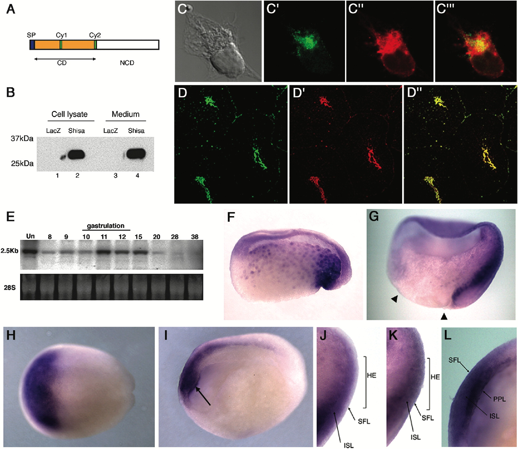 (E) Developmental Northern blotting of shisa mRNA. Stages of samples are indicated at top. Hybridization with 32P-labeled shisa cDNA is in the middle. Ethidium bromide staining of 28S RNA is at the bottom.
