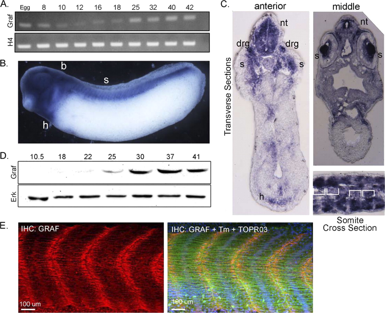 (somite borders indicated with brackets). D, Western blot analysis of GRAF1 and ERK (loading control) expression at the indicated developmental stages. E, laser