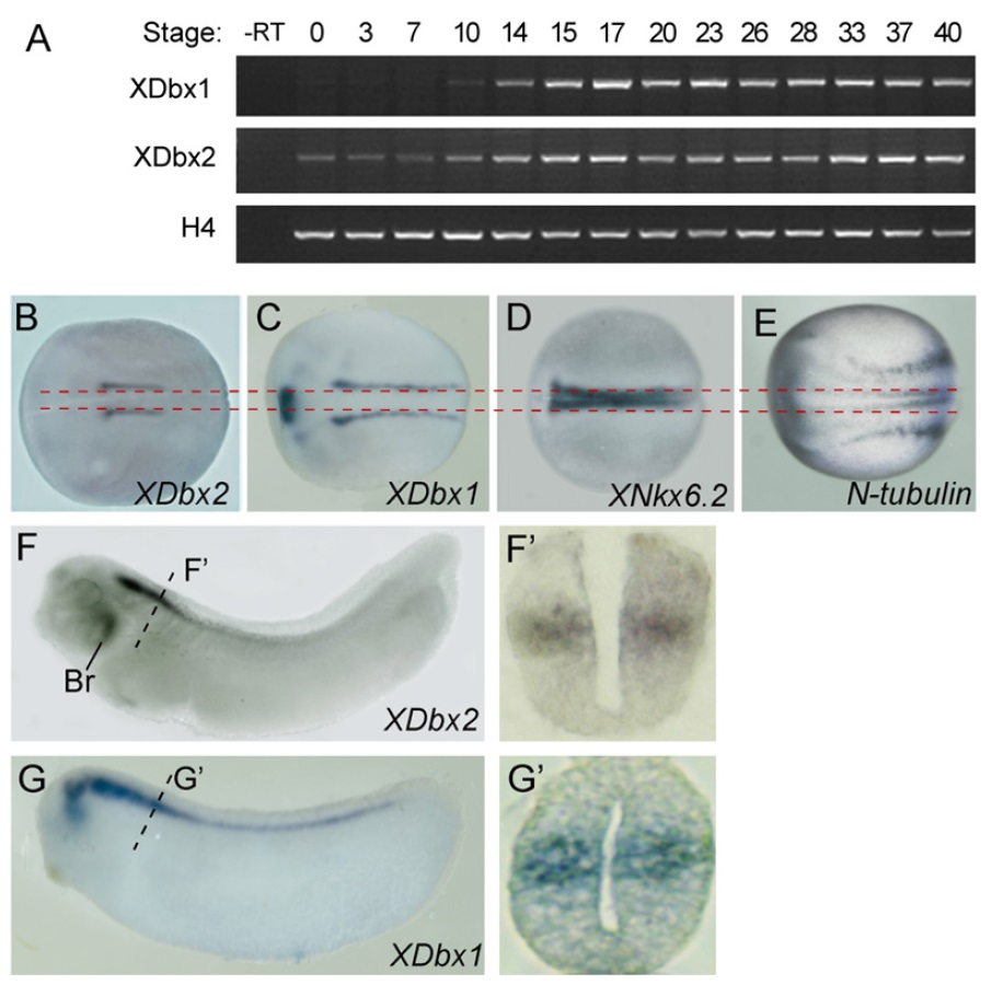 Fig. 2. The temporal and spatial expression patterns of XDbx. (A) RT-PCR analysis of the developmental expression of XDbx1 and XDbx2. (BâG) The expression patterns of