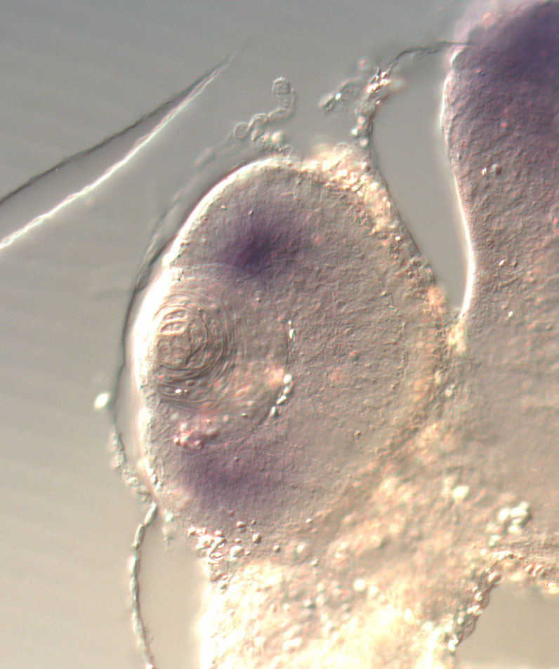 pisdl (phosphatidylserine decarboxylase like) gene expression in sectioned eye of X. laevis embryo, assayed via in situ hybridization, NF stage 39-40, lens epithelium and anterior left, dorsal up. Copyright © Perron Lab