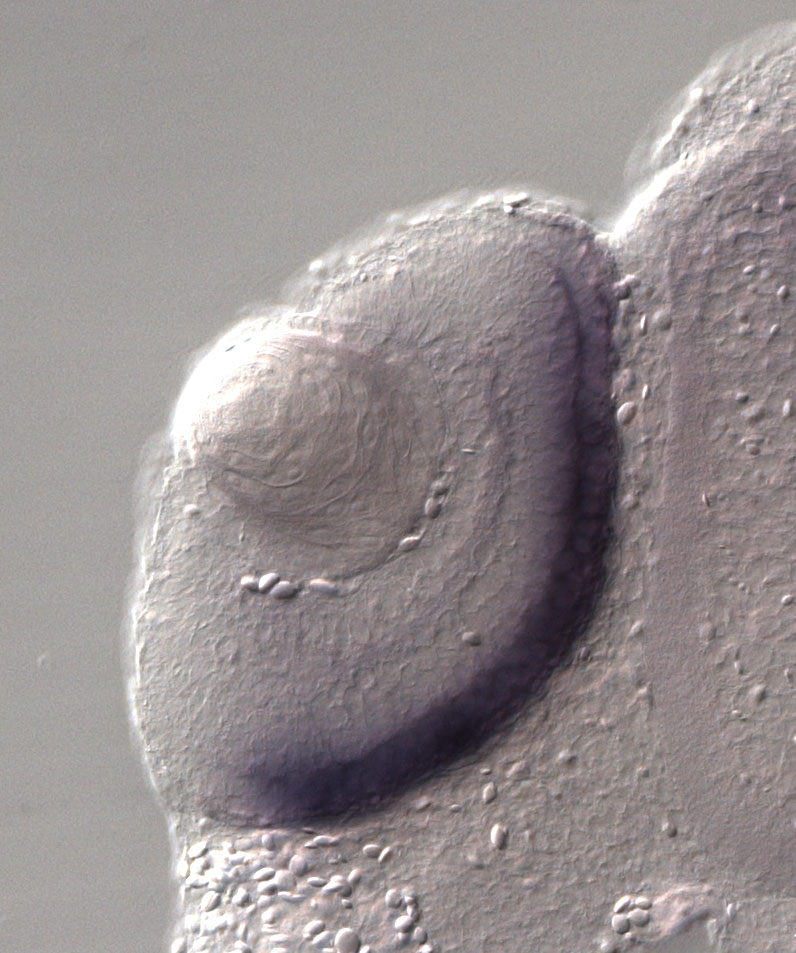 usp21 (ubiquitin specific peptidase 21) gene expression in sectioned eye of X. laevis embryo, assayed via in situ hybridization, NF stage 39-40, lens epithelium and anterior left, dorsal up. Copyright © Perron Lab