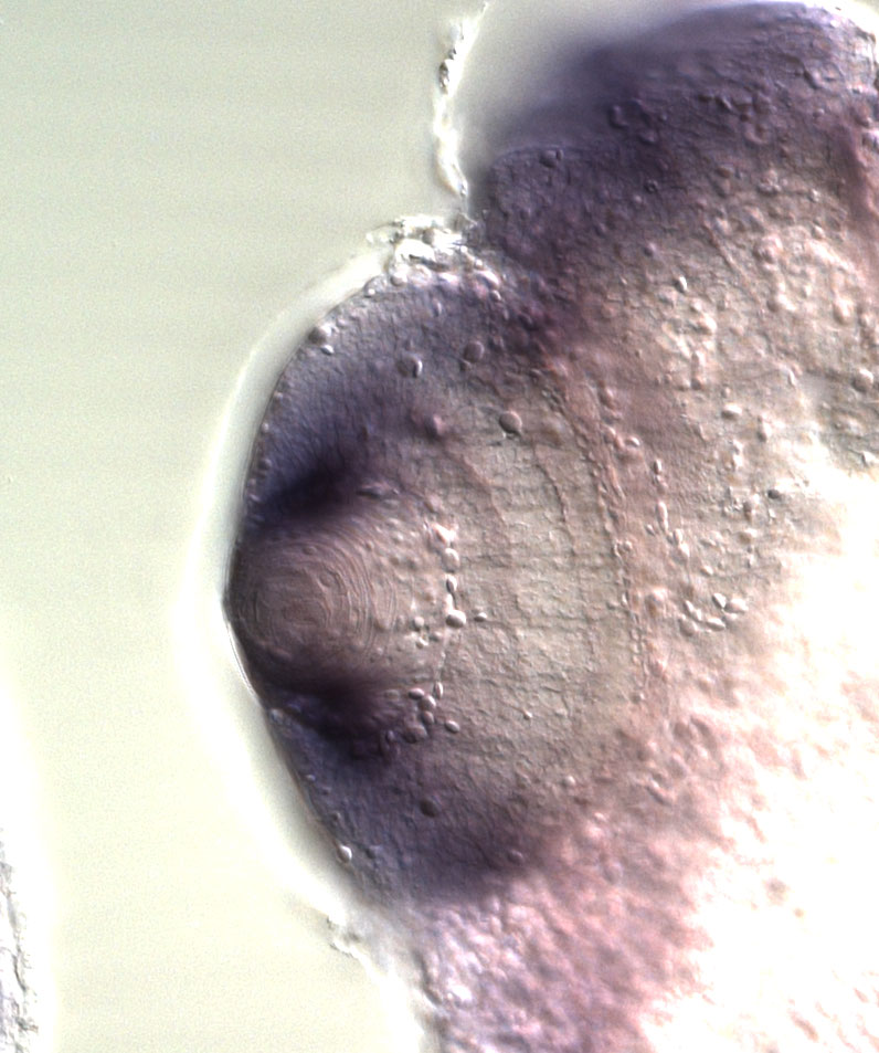 eif2b1 (eukaryotic translation initiation factor 2B subunit alpha) gene expression in sectioned eye of X. laevis embryo, assayed via in situ hybridization, NF stage 39-40, lens epithelium and anterior left, dorsal up. Copyright © Perron Lab