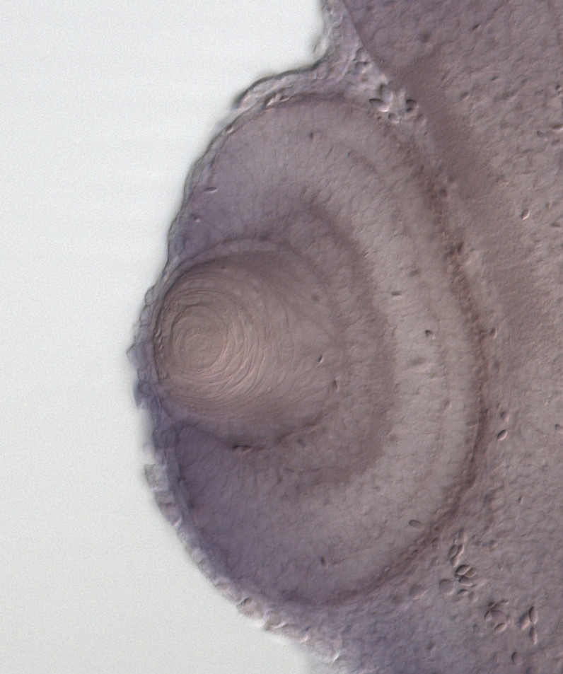 cavin2 (caveolae associated protein 2) gene expression in sectioned eye of X. laevis embryo, assayed via in situ hybridization, NF stage 39-40, lens epithelium and anterior left, dorsal up. Copyright © Perron Lab