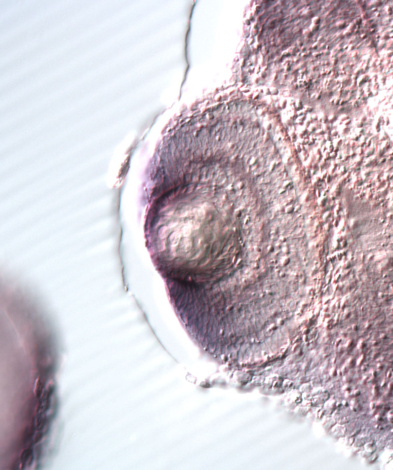 prpf31 (pre-mRNA processing factor 31) gene expression in sectioned eye of X. laevis embryo, assayed via in situ hybridization, NF stage 39-40, lens epithelium and anterior left, dorsal up. Copyright © Perron Lab