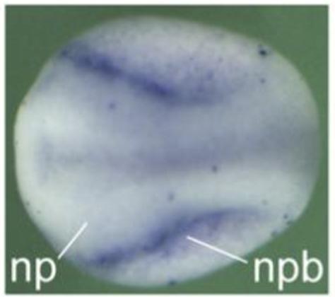 hgf (hepatocyte growth factor (hepapoietin A; scatter factor)) gene expression in Xenopus laevis embryo, assayed via in situ hybridization, NF stage 15-20, dorsal view, anterior left. This image is extracted from figure published in: Zhang Z et al. (2017) Copyright © 2017. Image reproduced with permission of the Publisher and the copyright holder. This is an Open Access article distributed under the terms of the Creative Commons Attribution License.