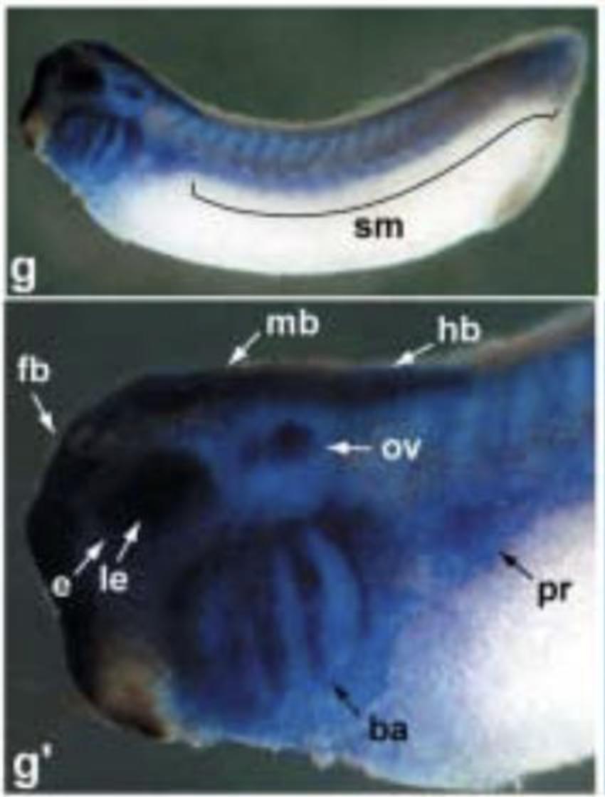 zc3h15 (zinc finger CCCH-type containing 15) gene expression in Xenopus laevis embryo, assayed via in situ hybridization, NF stage 32, lateral view, anterior left, dorsal up. This image is extracted from figure published in: Ishikawa K et al. (2005) Copyright © 2005. Image reproduced with permission of the Publisher.