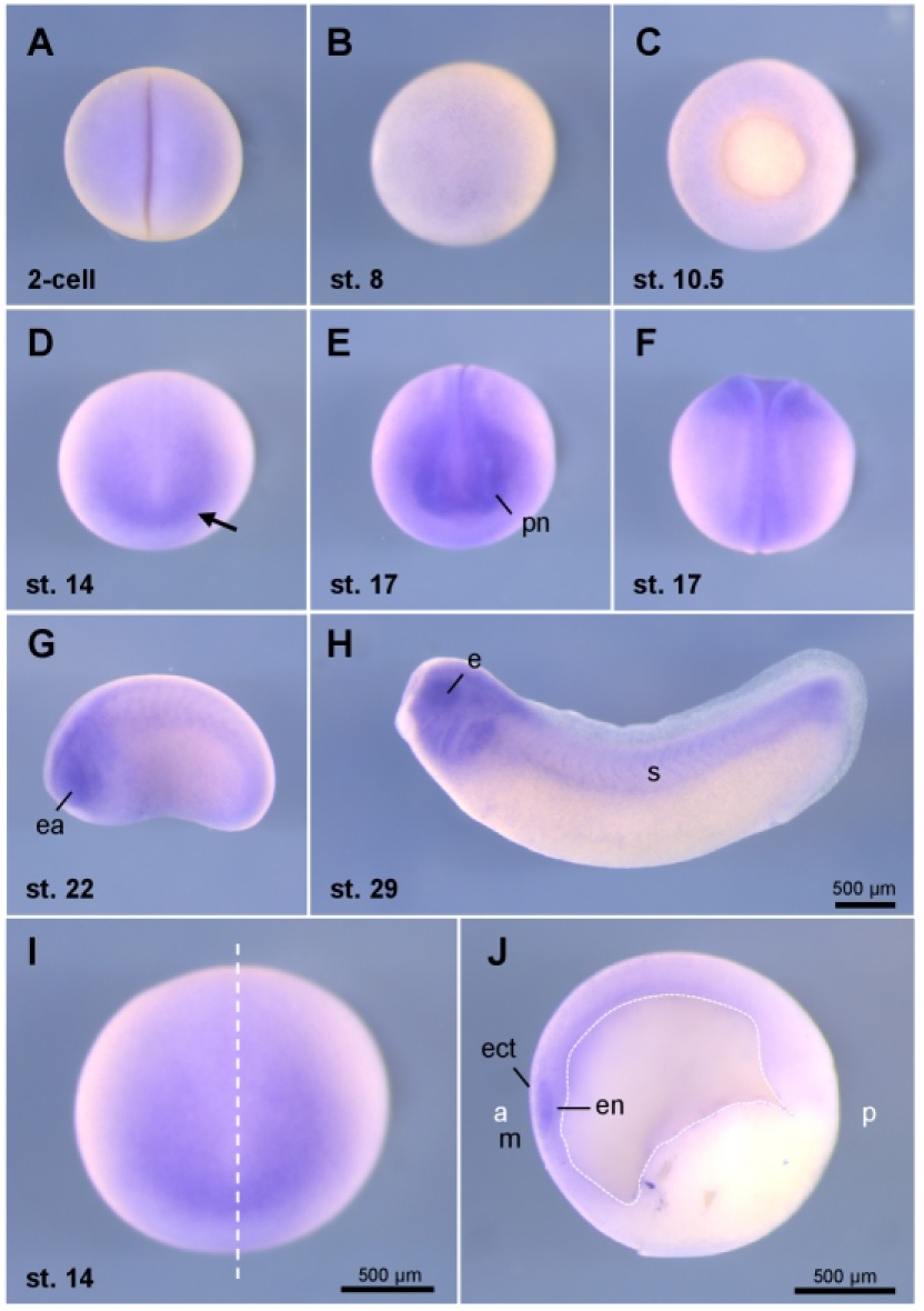 blastula stage 8. C Embryo at gastrula stage 10.5. D Embryo at neurula stage 14,