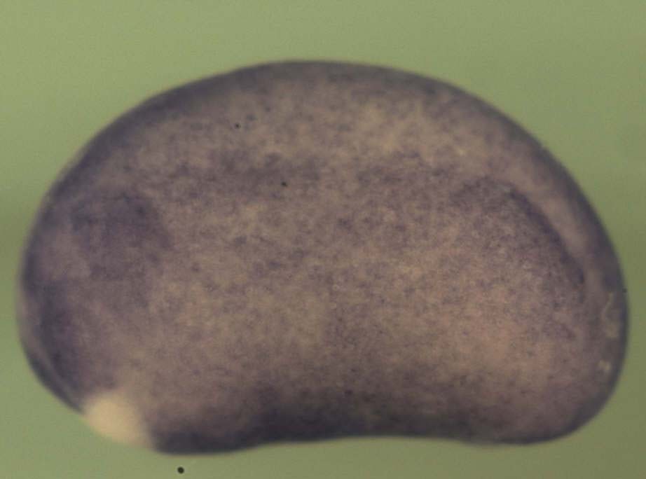 ccnb1.2 (cyclin B1) gene expression in Xenopus laevis, assayed via situ hybridization, NF stage 20 embryo, lateral view, anterior left.