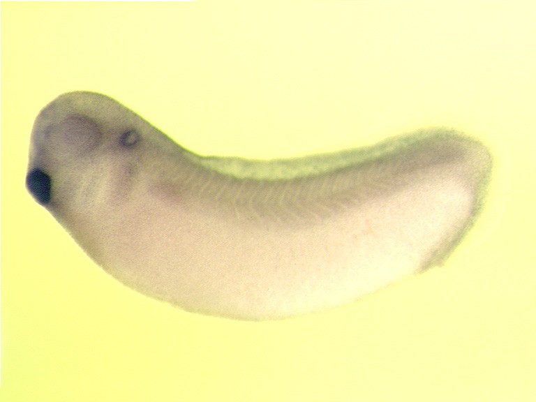 c12orf23 gene expression in Xenopus laevis embryo via in situ hybridization, NF stage 28, lateral view, anterior left.