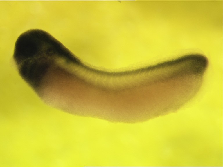 naa40 gene expression in Xenopus laevis embryo via in situ hybridization, NF stage 29 & 30, lateral view, anterior left.