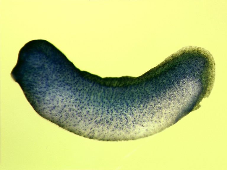 ftmt < ferritin mitochondrial [Predicted: Source is Human Entrez Gene] > gene expression in Xenopus laevis, via in situ hybridization, NF stage 29&30 embryo, lateral view, anterior left.