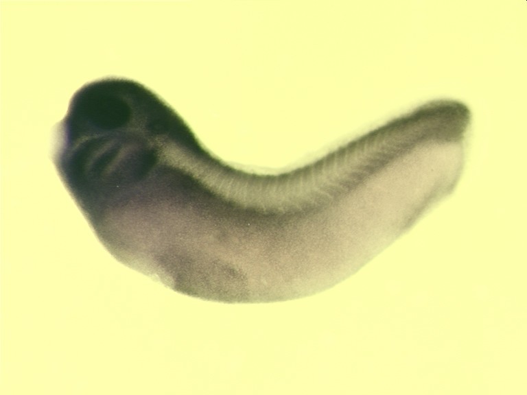 anp32b gene expression in Xenopus laevis embryo via in situ hybridization, NF stage 29 & 30, lateral view, anterior left.
