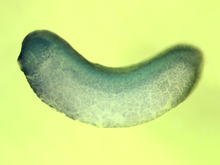 aldh16a1 (aldehyde dehydrogenase 16 family, member A1 protein) expressed in Xenopus laevis embryo via in situ hybridization, NF stage 29 and 30, lateral view, anterior left.