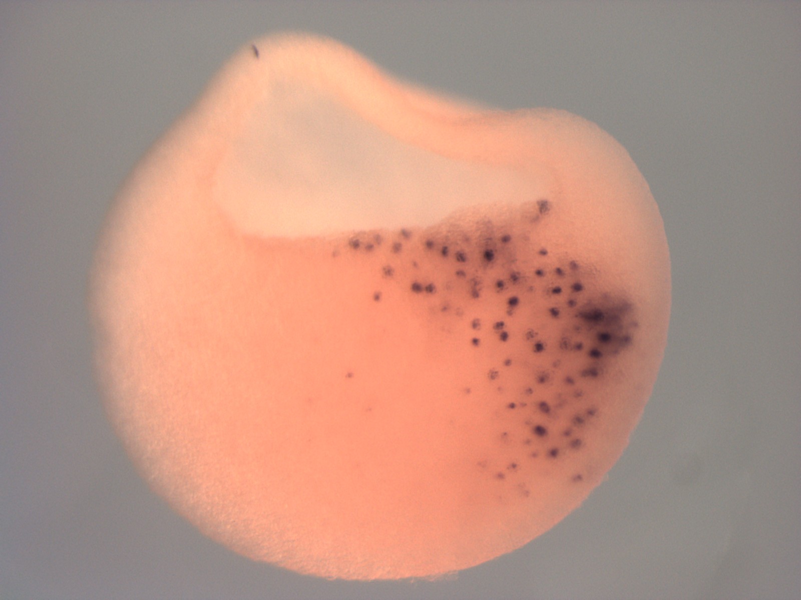 hhex (hematopoietically expressed homeobox)gene expression in bisected Xenopus laevis embryo, midsagittal section, via in situ hybridization, NF stage 9, dorsal right, anterior up.