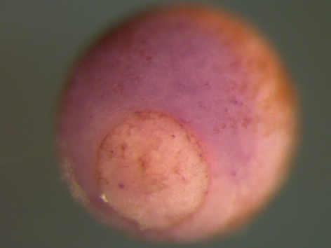 hypothetical protein LOC733562 (no gene symbol ) gene expression in Xenopus tropicalis embryo via in situ hybridization, NF stage 11, vegetal view, anterior left, dorsal up.