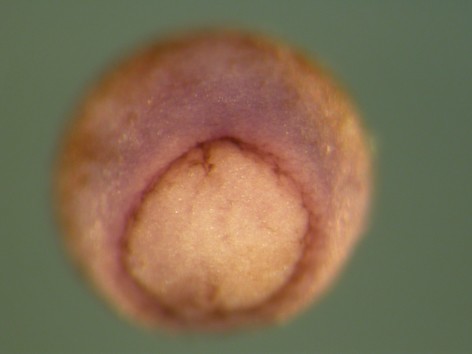 tcaf1(TRPM8 channel-associated factor 1) gene expression in Xenopus tropicalis embryo, assayed via in situ hybridization, NF stage 10, blastoporal view, dorsal up. Copyright © Smith Lab, James C Smith Image published in: Smith ISH & MO Screen
