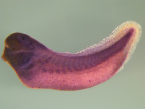 cda (cytidine deaminase) gene expression in Xenopus tropicalis embryo, assayed via in situ hybridization, NF stage 33 & 34, lateral view, anterior left, dorsal up. Copyright © Smith Lab, James C Smith Image published in: Smith ISH & MO Screen
