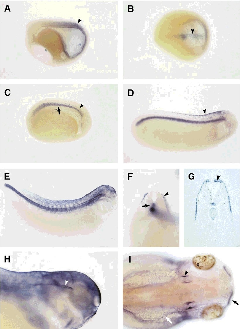 Arrowhead indicates sensorial layer of the ectoderm. E: Side view of a stage 33 tailbud. F: Optical transverse section in the trunk of a stage 30 tailbud. Arrowhead indicates sensorial layer of ectoderm, arrow points to the floor-plate of the neural tube. G: Transverse paraffin section of a whole-mount stained, stage 33 tailbud, through the hindbrain. Arrowhead points to expression in the roof plate, which was cracked during process- ing. H: Stage 35 tailbud, side view. White arrowhead indicates the intensely stained floor plate of the brain. I: Top view of the head of a stage 40 tadpole. Arrowhead indicates auditory epithelium. Black arrow points to olfactory epithelium, slightly out of the plane of focus and white arrow indicates staining in the epidermis. Image published in: Urry LA et al. (1998) Copyright © 1998. Image reproduced with permission of the Publisher, John Wiley & Sons.