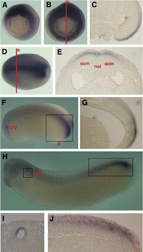 Vegetal view of an early gastrula (stage 10.5), with a strong expression in the dorsal marginal zone. (B) Vegetal view of a stage 11 gastrula. The transcripts are detected in the entire marginal zone. (C) Section from the line in (B), showing expression in the deep layer of dorsal marginal zone cells. (D) Dorsal view of a stage 15 early neurula. Expression is localized to the posterior region and the entire neural plate. (E) Section from the line in (D), showing expression in the deep layer of neural plate and absence of expression in the somites and notochord. (F) Lateral view of a stage 22 early tail-bud embryo, with the expression essentially de- tected in the tail bud and the forming otic vesicle (OV). (G) Section from inset in (F), showing expression in deep cells of the tail bud. (H) Lateral view of a stage 28 tail-bud embryo. The expression is restricted in the posterior tip of the tail bud and in the otic vesicle (OV). (I) Section from inset in (H), with higher magnification of the otic vesicle. (J) Section corresponding to inset in (H), showing expression in the tail bud including both unsegmented posterior mesoderm and neural precursor cells. Image published in: Bourdelas A et al. (2009) Copyright © 2009. Image reproduced with permission of the Publisher, University of the Basque Country Press.