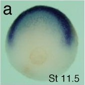 zic1 (Zic family member 1) gene expression in Xenopus laevis embryo via in situ hybridization, NF stage 11 & 12, vegetal view, dorsal up. This image is extracted from figure published in: Fujimi TJ et al. (2006), Image published in: Fujimi TJ et al. (2006) Copyright © 2006. Image reproduced with permission of the Publisher, John Wiley & Sons.
