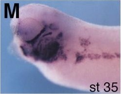 sostdc1 expression (sclerostin domain containing 1) assayed through in situ hybridization Xenopus laevis embryo, NF stage 35, lateral view, anterior to the left. Image published in: Itasaki N et al. (2003) Copyright © 2003. Image reproduced with permission of the Publisher and the copyright holder. This is an Open Access article distributed under the terms of the Creative Commons Attribution License.