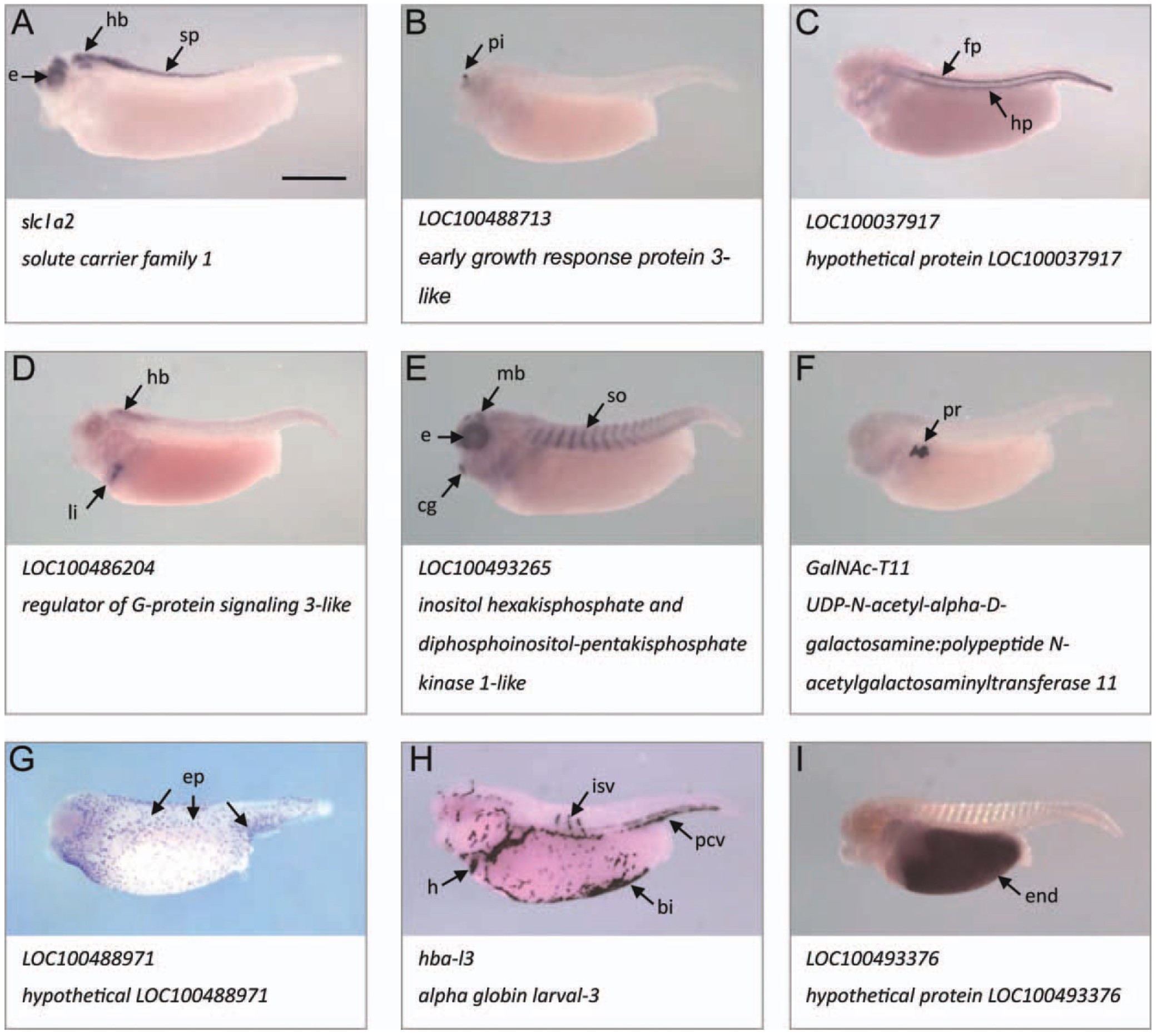 Examples of expression patterns obtained from the screen following whole mount in situ hybridization on stage 39 Xenopus tropicalis tadpoles. As expected from the origin of the cDNA libraries, a large proportion of the clones display expression in the nervous system including the eye (A) or in restricted areas of the nervous system such as the pineal gland (B) or floorplate/hypochord (C). Some are expressed in both the nervous system and in another tissue, such as the liver (D) or the somites (E). Other, however, are exclusively expressed outside the nervous system, for instance in the pronephros (F), in specialized cells of the epidermis, probably ionocytes (G), in blood islands and vessels (H) or in the endoderm (I).