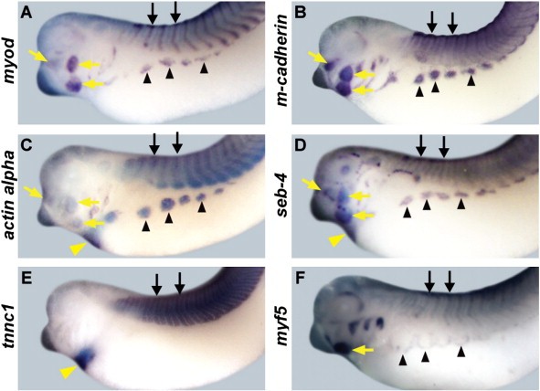 In stage 35â37 embryos myod, m-cadherin, actin alpha, seb-4, tnnc1 and myf5 are all expressed in skeletal muscle including somites (black arrows), migrating hypaxial muscle anlagen (black arrowheads) and jaw muscle (yellow arrows). myod, m-cadherin, actin alpha, seb-4, and myf5 (A-D and F) are expressed in the somites, migrating hypaxial muscle anlagen and jaw muscle, and these expression patterns overlap with those of ebf2 and ebf3 (Figure 2). m-cadherin (B) is weakly expressed in a central band in somites, with expression throughout the somite. myf5 (F) expression in somites is weaker than other genes at this stage, and is expressed at the leading edge of migrating hypaxial muscle. tnnc1 (E) is expressed in the somites. actin alpha, seb-4, and tnnc1 are expressed in the heart (yellow arrowheads). All embryos show lateral views.