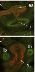 Confocal immunoflurescence of Nkx2-1 AB1 (green) staining trachea and lung buds/lung primordia, along with Sox2 AB1 (red) staining stomach and esophagus, in a NF stage 42 X. laevis embryo. This image is extracted from figure published in: Rankin SA et al. (2012), Image published in: Rankin SA et al. (2012) Copyright © 2012. Image reproduced with permission of the Publisher.