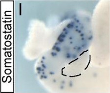 sst (somatostatin)gene expression in dissectd Xenopus tropicalis foregut, NF stage 36, as assayed by in situ hybridization. Lateral view: anterior left, dorsal up. This image is extracted from figure published in: Horb LD et al. (2009), Image published in: Horb LD et al. (2009) Copyright © 2009. Image reproduced with permission of the Publisher, John Wiley & Sons.