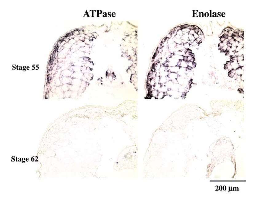 Fig. 5. In situ hybridization of NF55 and 62 tail cross sections using probes for two down-regulated genes. ATPase (BQ383639)is a mitochondrial gene; enolase (BQ736040) is a gene from the glycolysis pathway. Image published in: Das B et al. (2006) Copyright © 2006. Image reproduced with permission of the Publisher, Elsevier B. V.