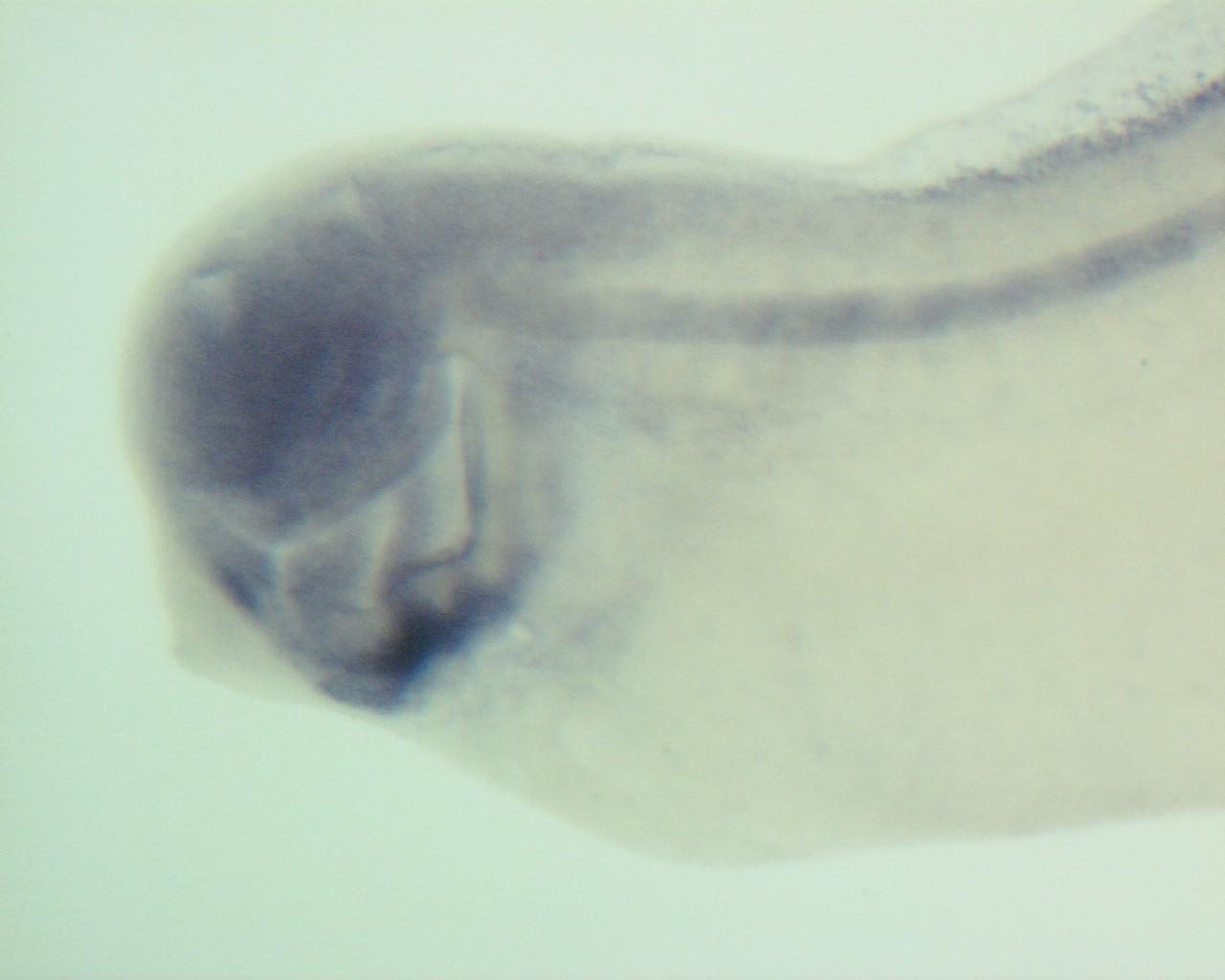 acvrl1 (activin A receptor type II-like 1) gene expression in Xenopus tropicalis embryo, assayed via in situ hybridization, NF stage 35 & 36, lateral view, head and anterior trunk region only, anterior left, dorsal up. Copyright © Patient Lab Image created by: Aldo Ciau-Uitz