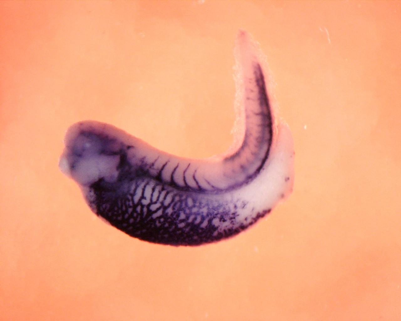 cdf (complement factor D (adipsin)) gene expression in Xenopus laevis embryo, assayed via in situ hybridization, NF stage 37 & 38 lateral view, anterior left, dorsal up.