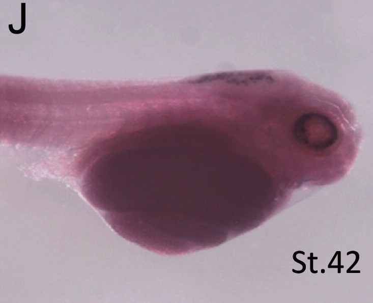 prdm13 (PR domain containing 13) gene expression in Xenopus laevis embryo, assayed via in situ hybridization, NF stage 42, lateral view dorsal up, anterior right. This image is extracted from figure published in: Hanotel J et al. (2014), Image published in: Hanotel J et al. (2014) Copyright © 2014. Image reproduced with permission of the Publisher.