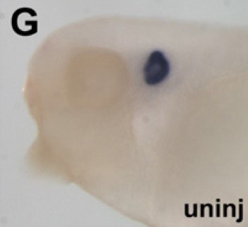 oc90 (otoconin 90) gene expression in Xenopus tropicalis embryo, assayed via in situ hybridization, NF stage 28, lateral view, head region, anterior left, dorsal up. This image is extracted from figure published in: Chung HA et al. (2014), Image published in: Chung HA et al. (2014) Copyright © 2014. Image reproduced with permission of the Publisher and the copyright holder. This is an Open Access article distributed under the terms of the Creative Commons Attribution License.