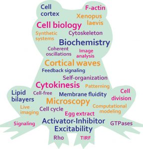 Our lab is interested in how cells successfully divide into two daughter cells. This process ensures accurate segregation of the genome and cellular contents and is essential human development and disease. One outstanding question in the field is how the cell cortex is remodeled to support large-scale shape change during cytokinesis, the final stage of the cell cycle. It has recently been shown that the cell cortex is dynamically patterned prior to the onset of cytokinesis, and we are interested in defining the mechanisms of dynamic pattern formation at the cell cortex. This cortical patterning is self-organized and is driven by coupled positive and negative feedback signaling. We use synthetic approaches, including cell-free reconstitution of an artificial cell cortex, to study individual factors that support pattern formation like protein regulators, membrane composition and fluidity, and cell cycle state. The artificial cortex is an ideal system to answer such questions as it allows for direct manipulation of factors that are predicted to regulate cortical dynamics.